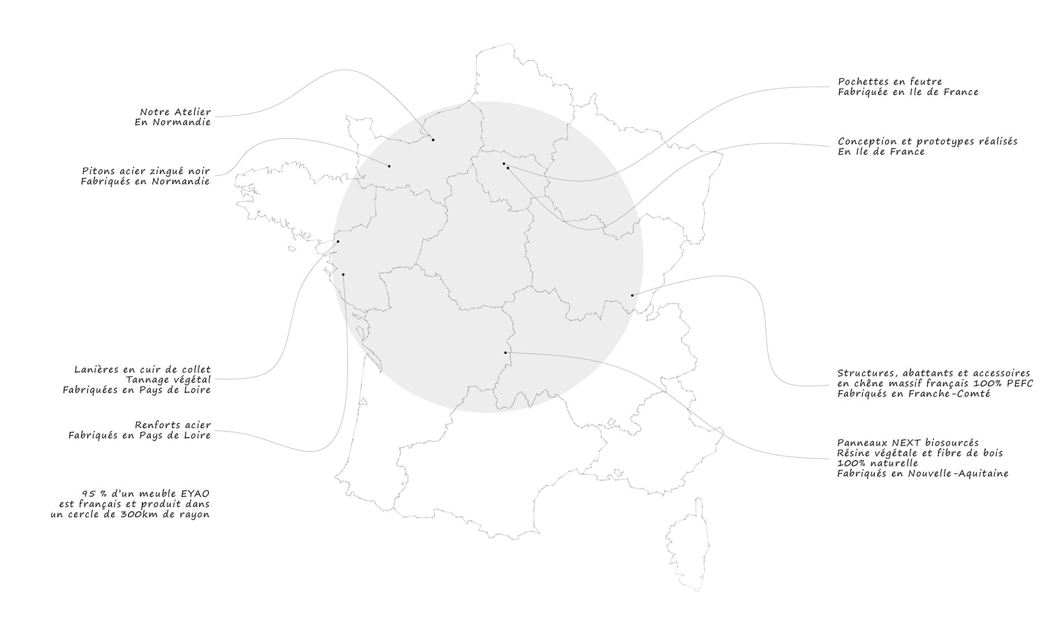 Les fonds de nos meubles et nos Pegboards sont réalisés en panneaux NEXT fabriqués par Les Panneaux de Corrèze en Nouvelle-Aquitaine. Ils utilisent une technologie biosourcée et brevetée de résine végétale (extraite de la production d’huile de colza et tournesol) et une fibre de bois 100% naturelle, réalisée à partir de coproduits du bois, issus de l’entretien de la forêt et de chutes de scieries, et de l’industrie agroalimentaire.